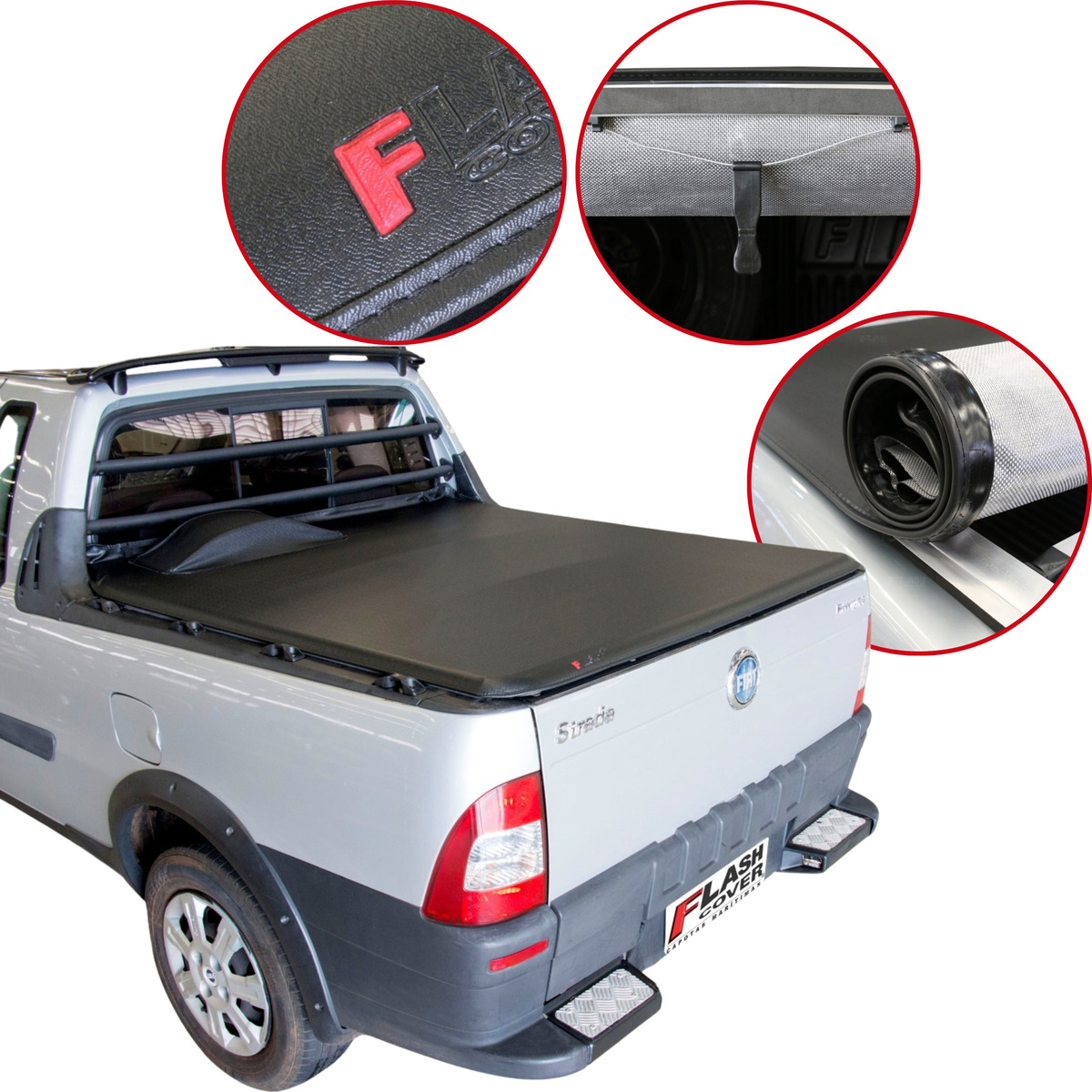 Após enrolar a lona é possível manter a mesma enrolada, devido as duas fitas de travamento que a capota possui, tudo isso de forma simples e fácil.