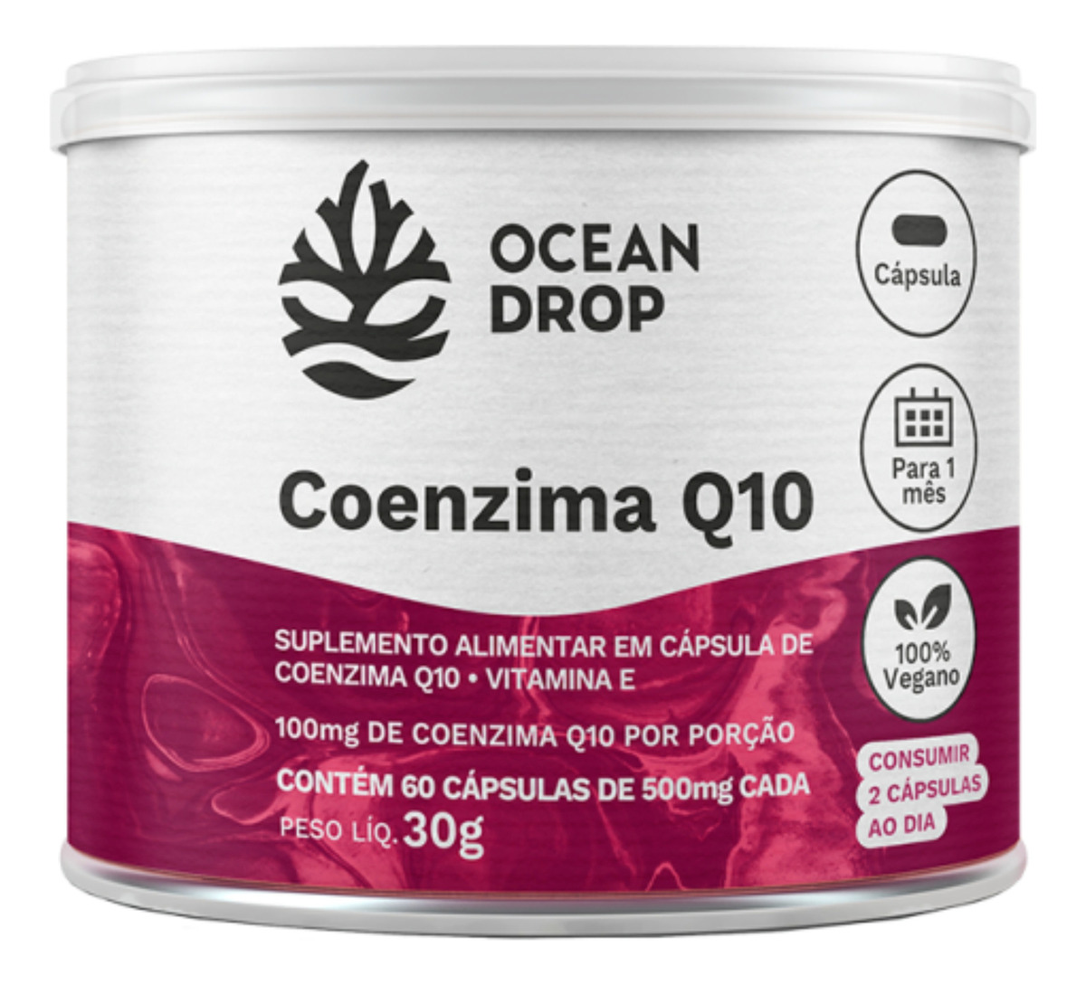 Coenzima Q10 da Ocean Drop com 60 cápsulas de 500mg cada. A Coenzima Q10, CoQ10 ou ubiquinona, é uma substância lipossolúvel semelhante a uma vitamina, que é produzida naturalmente pelo nosso corpo, e é considerada um cofator essencial na produção de energia e metabolismo energético.